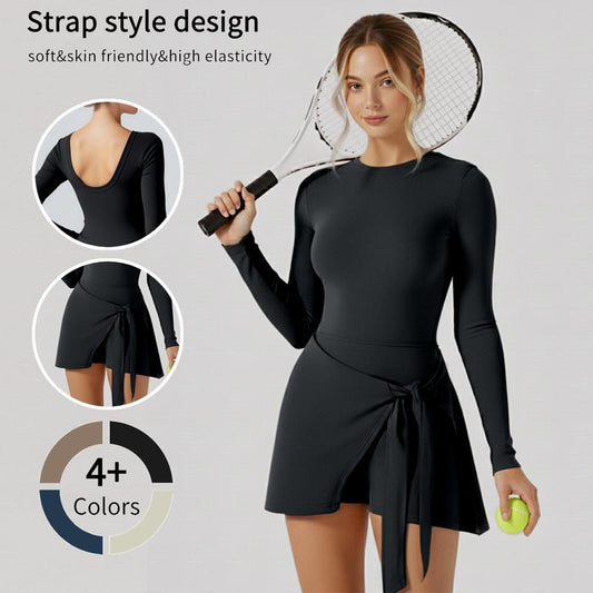 Women'S Solid Color High Neck Tennis Dress Long Sleeve Wrap Skirt Built-In Shorts Golf Athletic Outfit Casual Sportswear Summer Comfort Collar Gym Workout Athletic Running Yoga Machine Washable 92% Nylon 8% Elastane